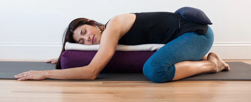During a restorative yoga practise the body is placed into lush, supported positions using a variety of props.